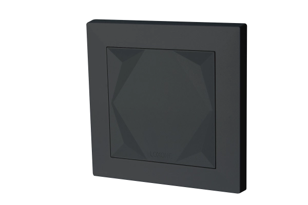 Der Loxone Touch Air verfügt überfünf Tastpunktezur Bedienung der wichtigsten Funktionen eines Raumes. Bei Berührung einer Taste erfolgt ein Klicken alsakustische Bestätigung. Zur Messung vonTemperatur und relativer Luftfeuchteist ein Sensor integriert.