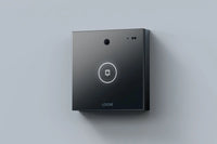 Die Loxone Intercom ist eine kompakte Video Türsprechstelle mit Glasfront, beleuchteter Klingeltaste und Näherungssensor. Das Mikrofon ist in der Frontplatte, die Lautsprecher unsichtbar an der linken Gehäuseseite integriert.